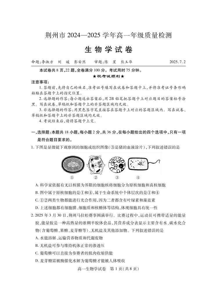 湖北省荆州市2024-2025学年高一年级质量检测 生物.pdf