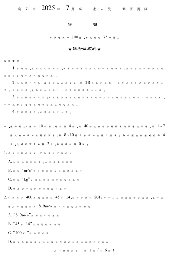 湖北省襄阳市2025年7月高一期末统一调研测试 物理.pdf