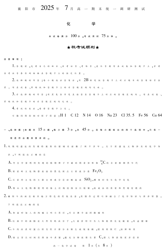 湖北省襄阳市2025年7月高一期末统一调研测试 化学.pdf