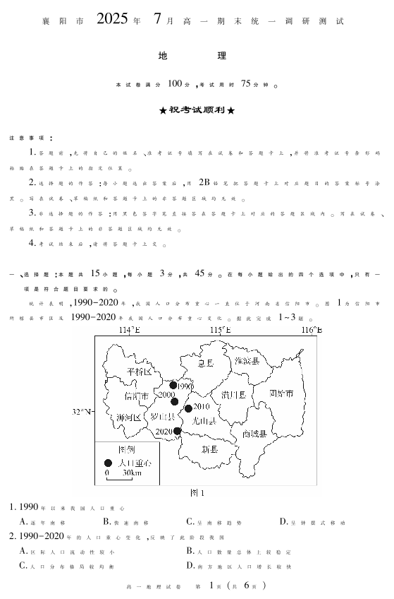 湖北省襄阳市2025年7月高一期末统一调研测试 地理.pdf