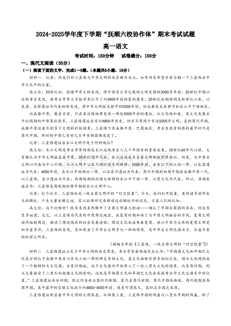 辽宁省抚顺市六校协作体2024-2025学年高一下学期期末考试 语文试卷(含答案).pdf