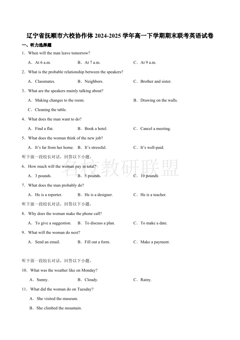 辽宁省抚顺市六校协作体2024-2025学年高一下学期期末考试 英语试卷(含答案).pdf