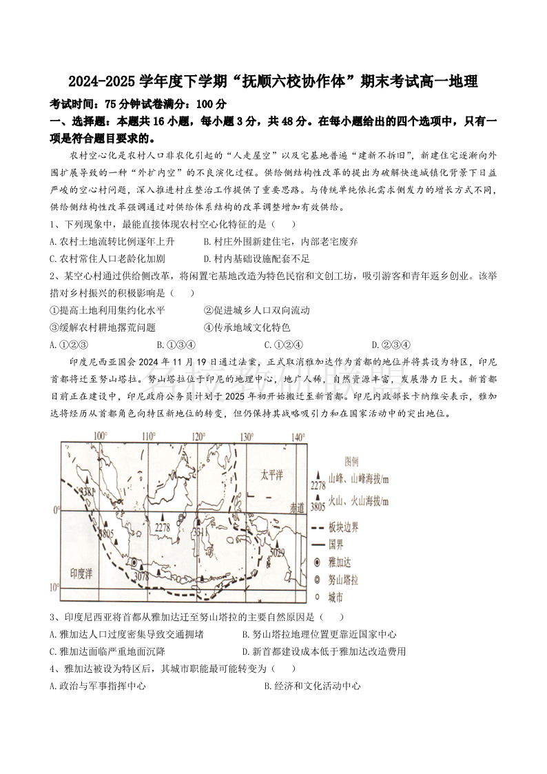辽宁省抚顺市六校协作体2024-2025学年高一下学期期末考试 地理试卷(含答案).pdf