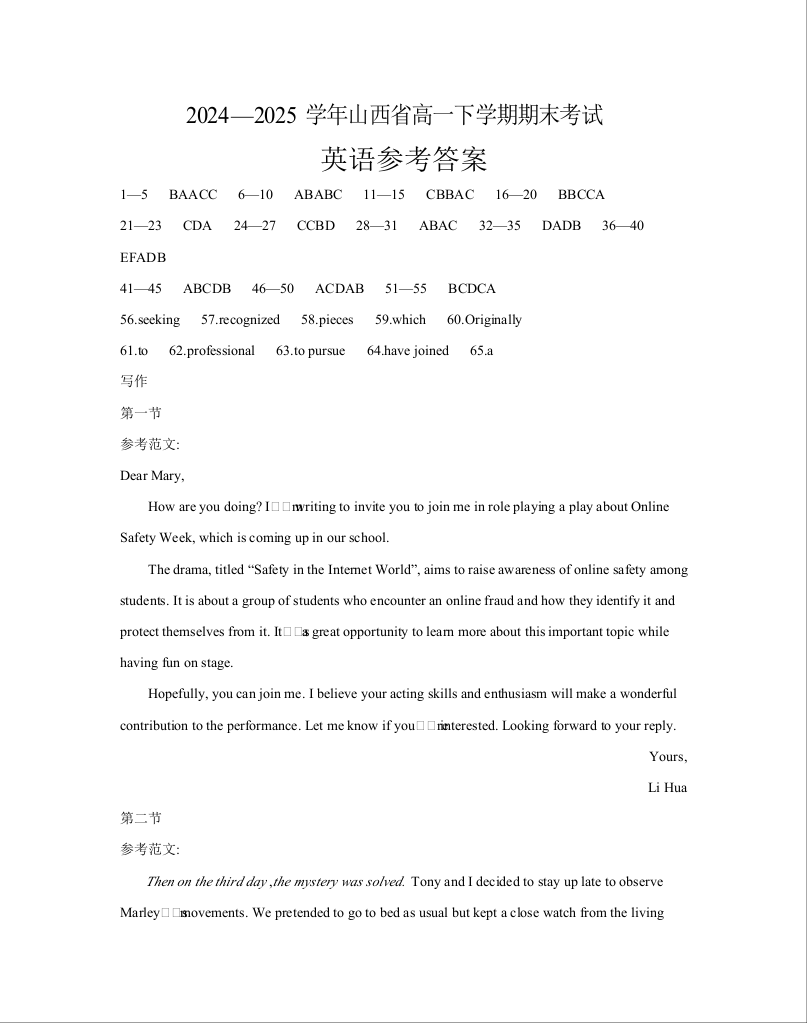 山西省2024-2025学年高一下学期期末考试 英语答案.docx