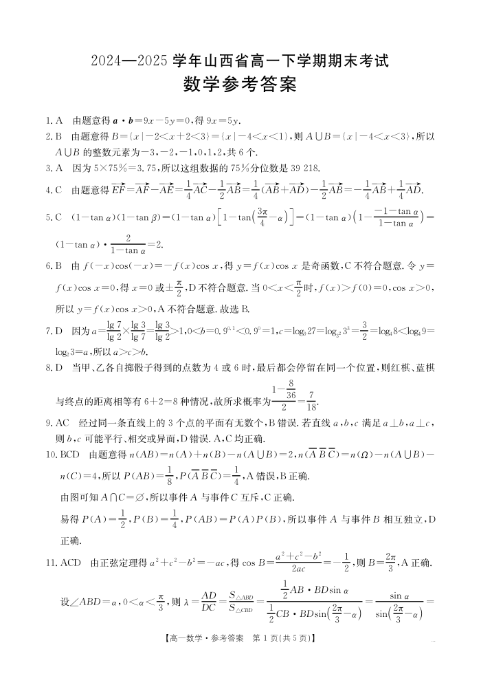 山西省2024-2025学年高一下学期期末考试 数学答案.pdf