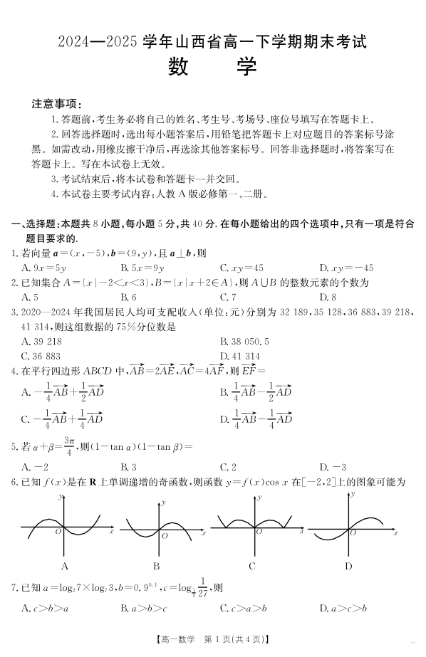 山西省2024-2025学年高一下学期期末考试 数学.pdf