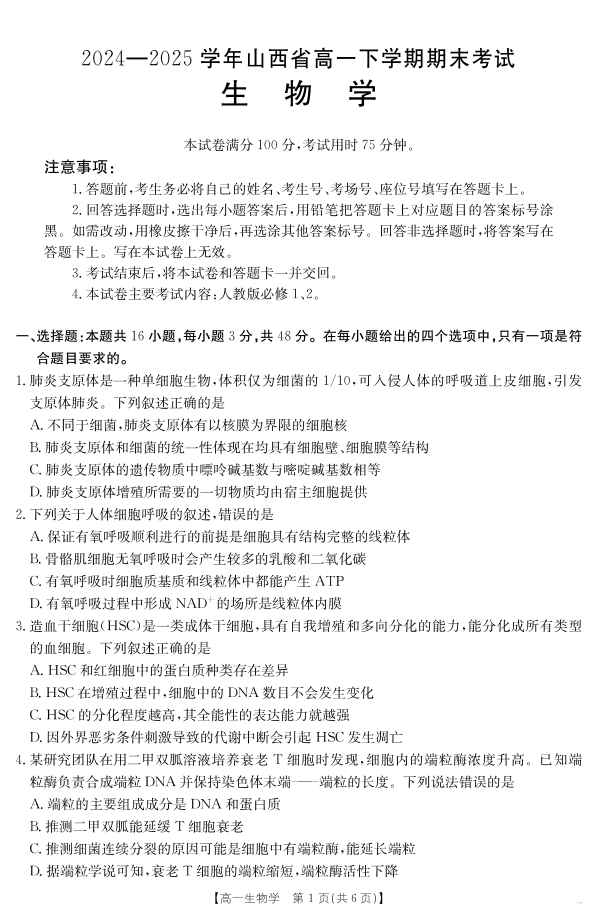 山西省2024-2025学年高一下学期期末考试 生物.pdf