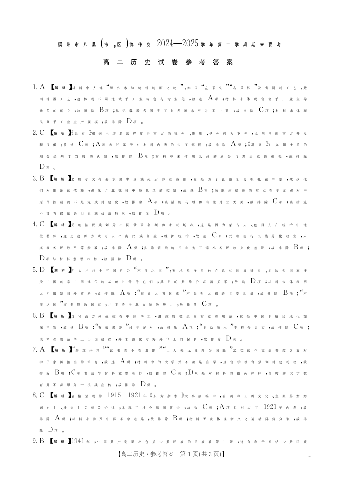 福州市八县(市,区)协作校2024-2025学年第二学期期末联考 历史答案.pdf