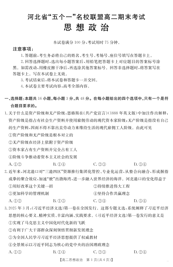 河北省“五个一”名校联盟2024-2025学年高二期末考试 思想政治.pdf