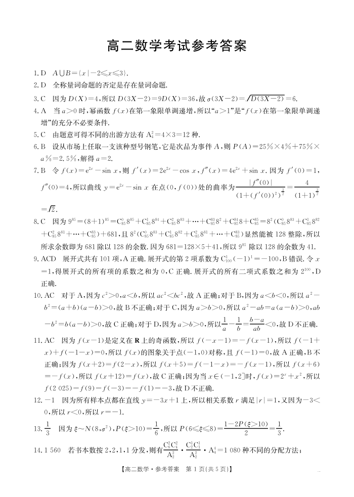 河北省2024-2025学年高二下学期7月联考 数学答案.pdf