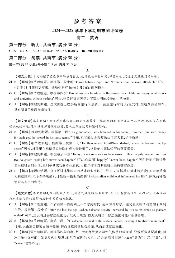 2024—2025学年下学期期末测评试卷 英语答案.pdf