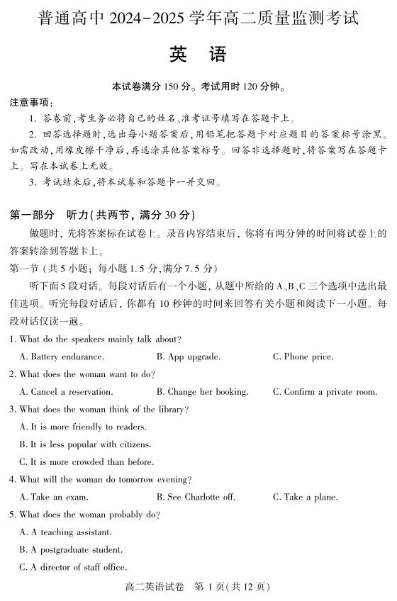 恩施州普通高中2024-2025学年高二质量监测考试 英语.pdf