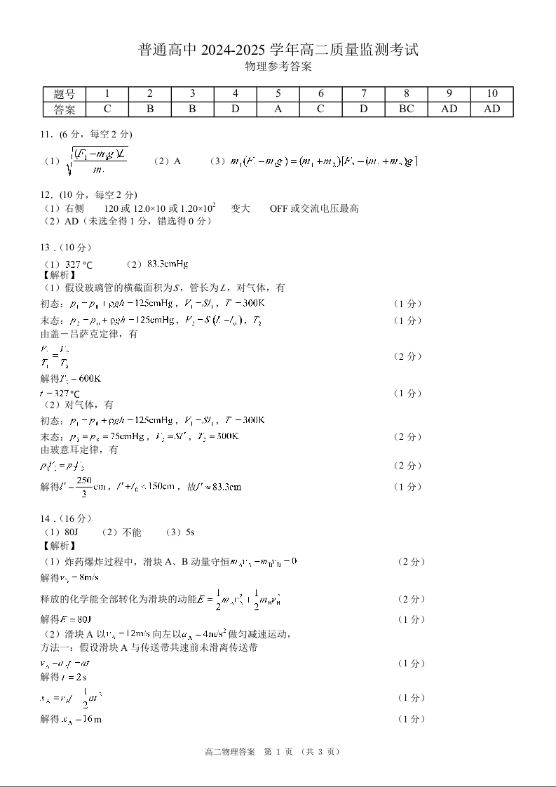 恩施州普通高中2024-2025学年高二质量监测考试 物理答案.docx