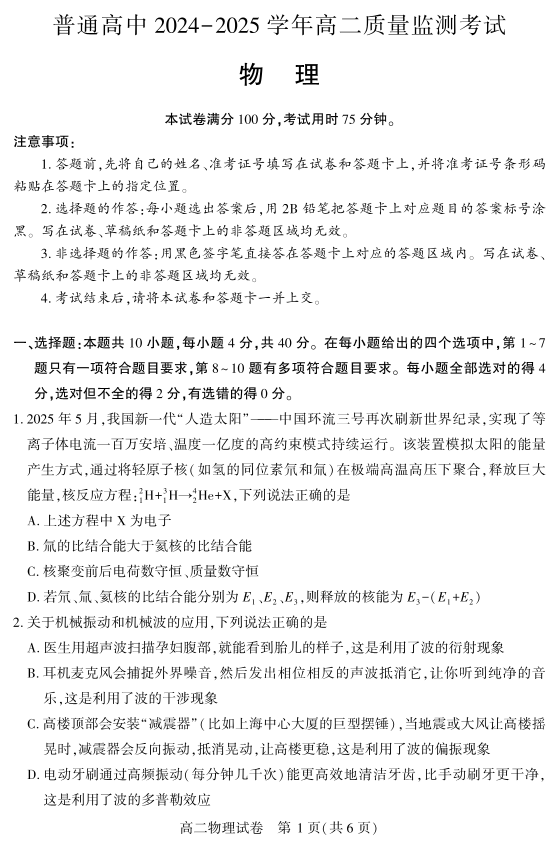 恩施州普通高中2024-2025学年高二质量监测考试 物理.pdf