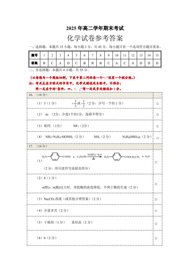 恩施州普通高中2024-2025学年高二质量监测考试 化学答案.pdf