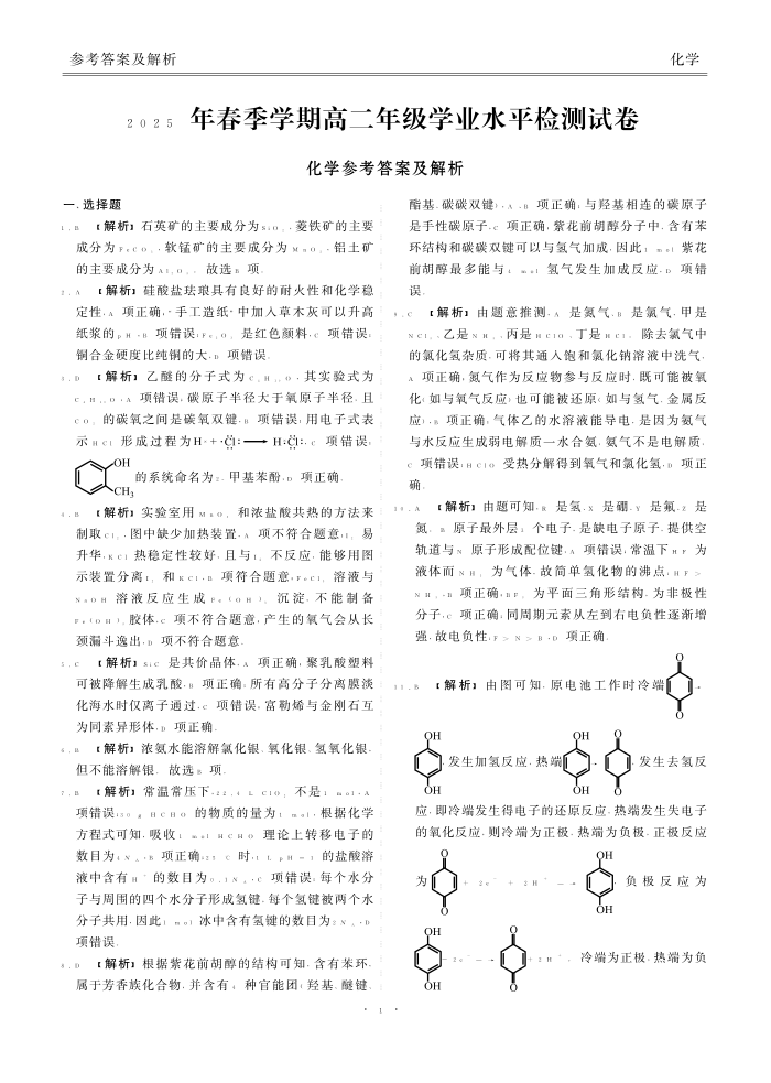 2025年春季学期高二年级学业水平检测试卷 化学答案.pdf