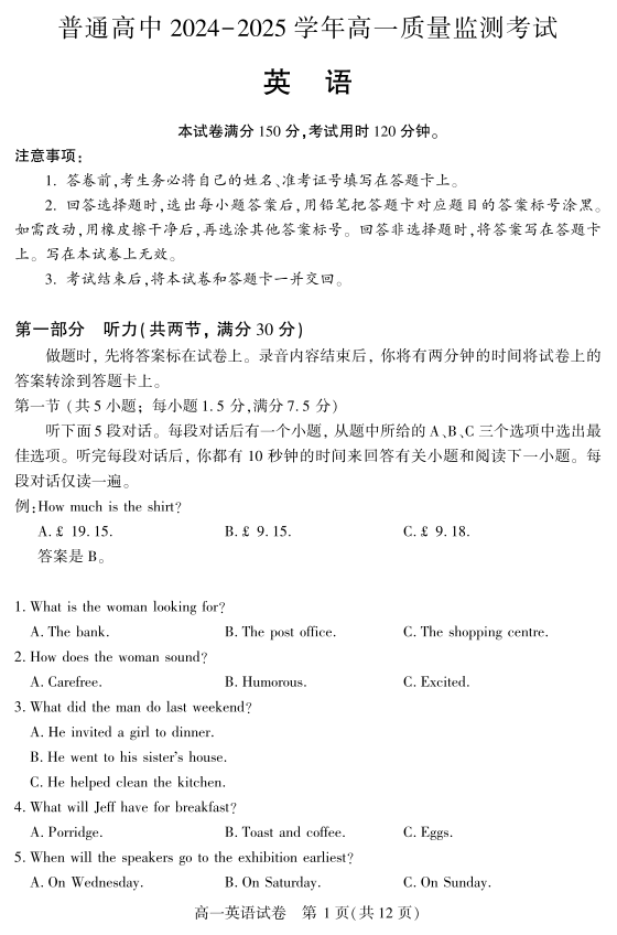 恩施州普通高中2024-2025学年高一质量监测考试 英语.pdf