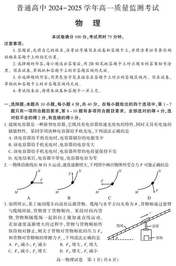 恩施州普通高中2024-2025学年高一质量监测考试 物理.pdf