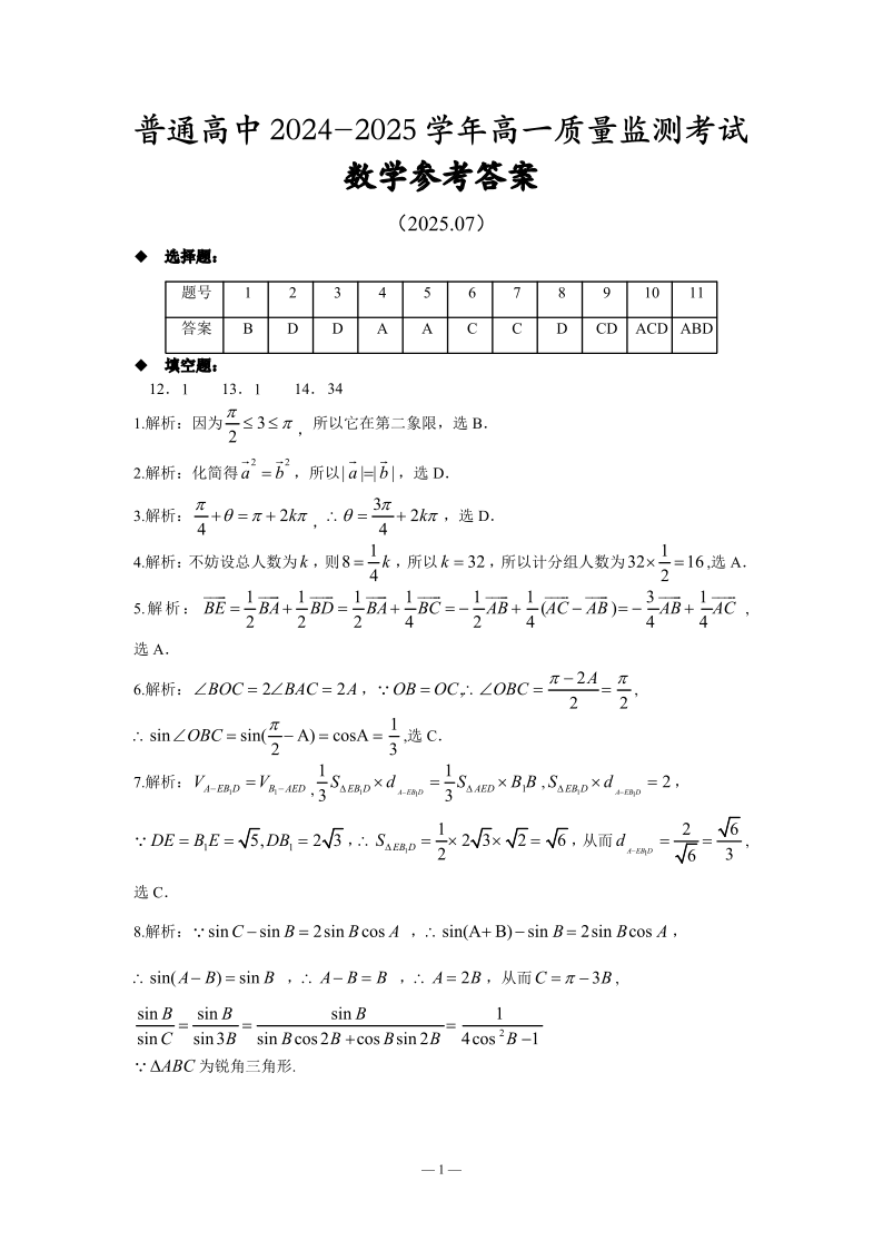 恩施州普通高中2024-2025学年高一质量监测考试 数学答案.pdf