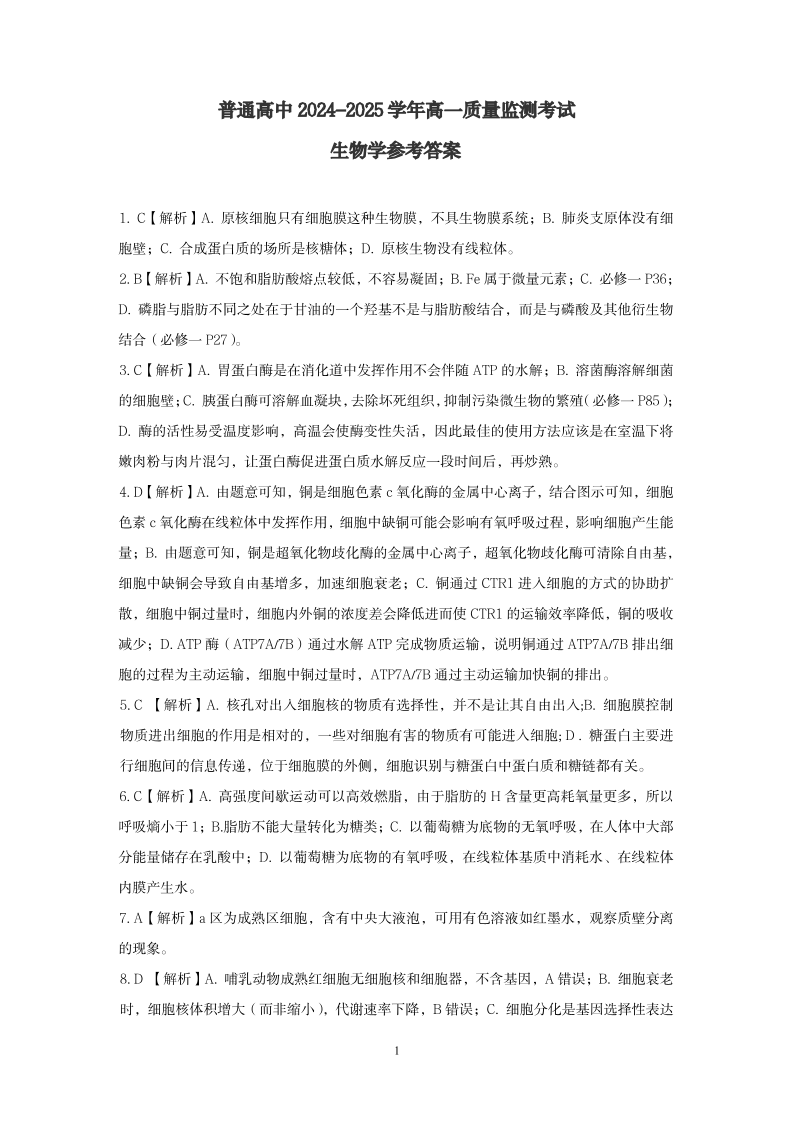 恩施州普通高中2024-2025学年高一质量监测考试 生物答案.pdf