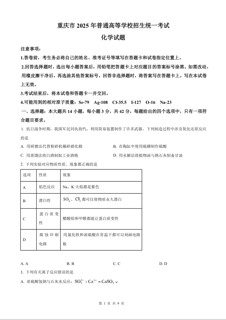 2025年重庆高考真题化学试题.docx