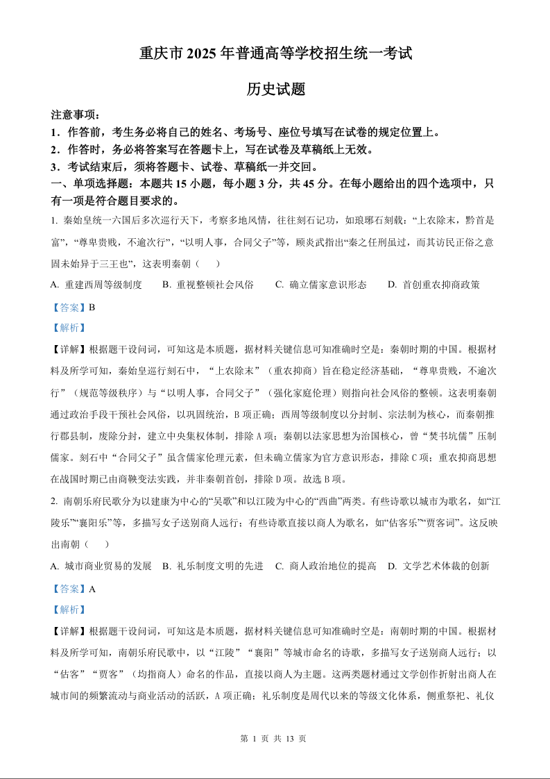 2025年重庆市高考历史真题(含解析).docx