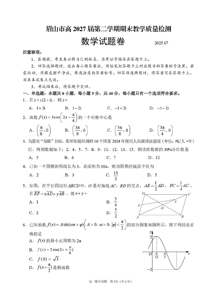 眉山市高2027届第二学期期末教学质量检测 数学试卷(含答案).pdf