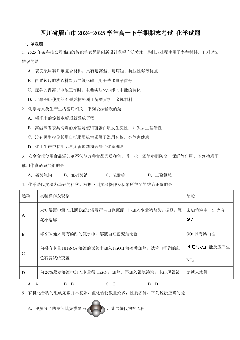 眉山市高2027届第二学期期末教学质量检测 化学试卷(含答案).docx