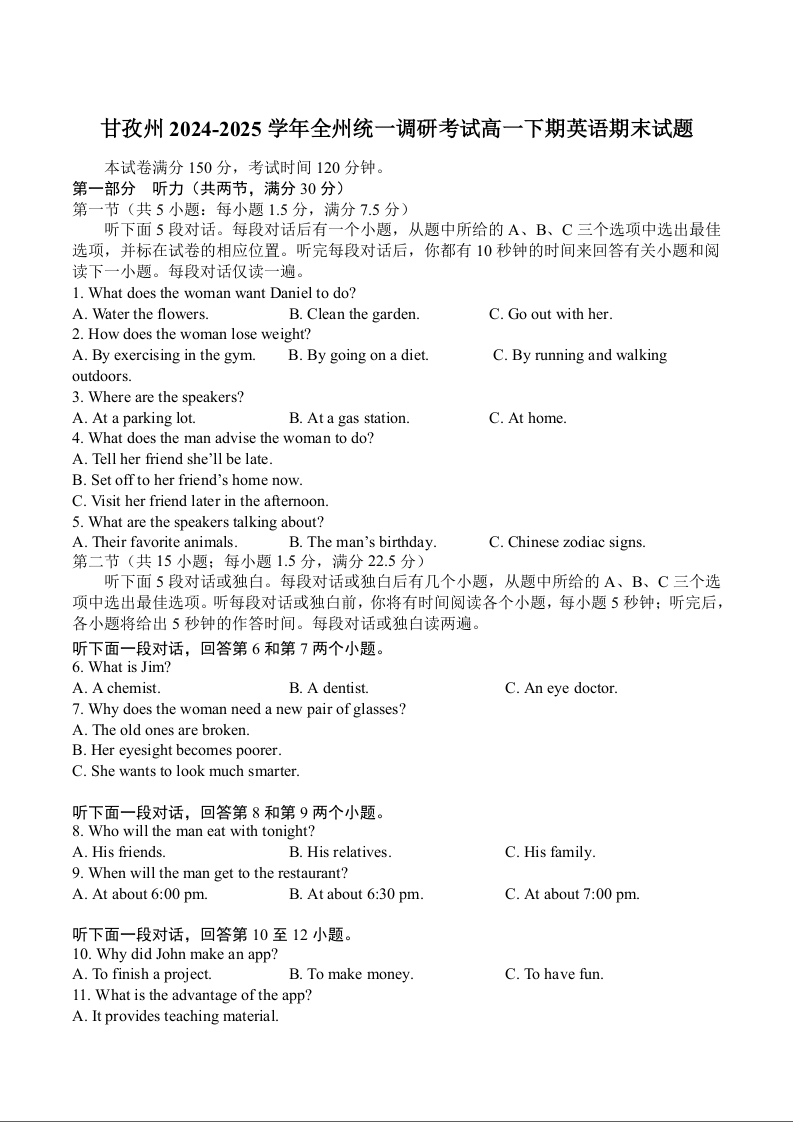 甘孜州2024-2025学年全州统一调研考试 英语试卷(含答案).docx