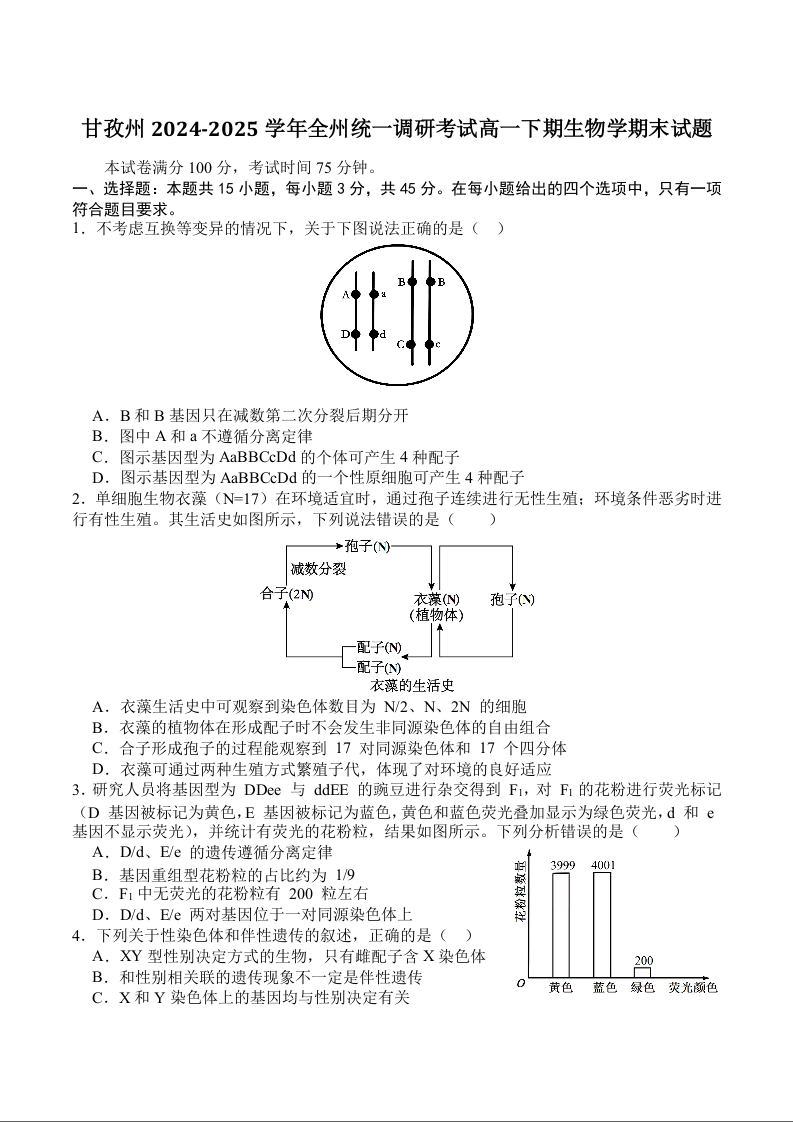 甘孜州2024-2025学年全州统一调研考试 生物试卷(含答案).docx