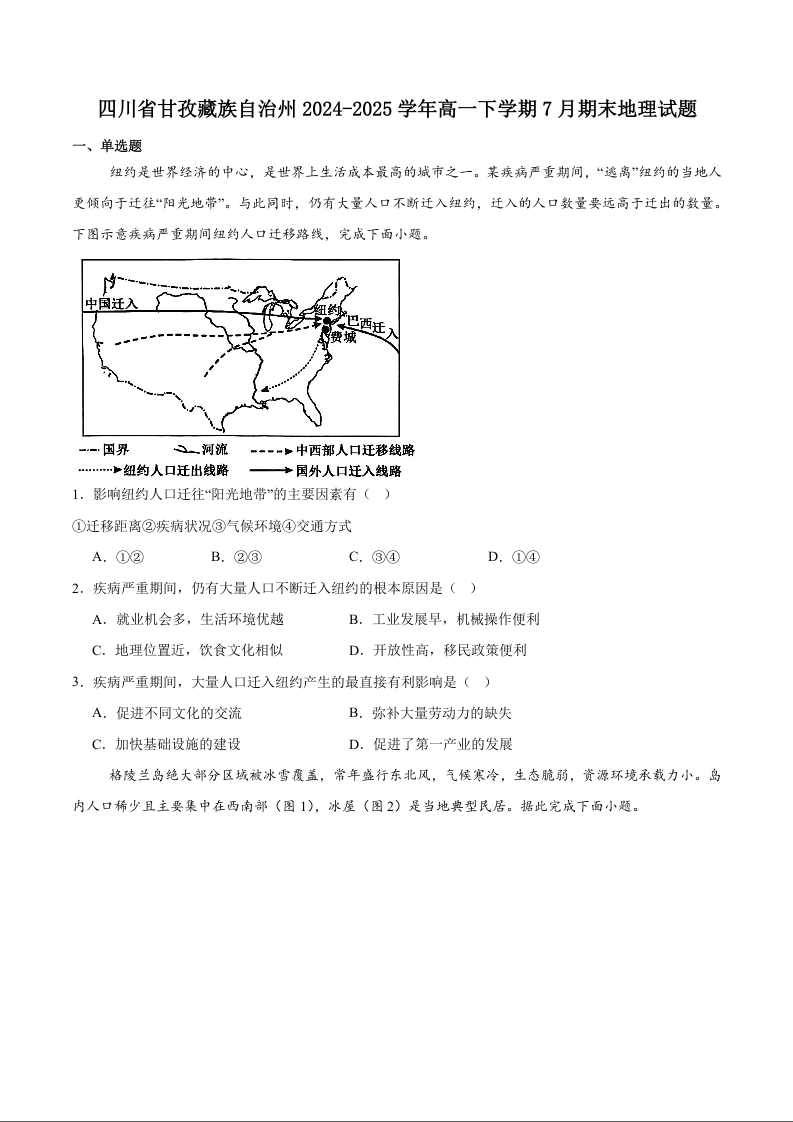 甘孜州2024-2025学年全州统一调研考试 地理试卷(含答案).docx