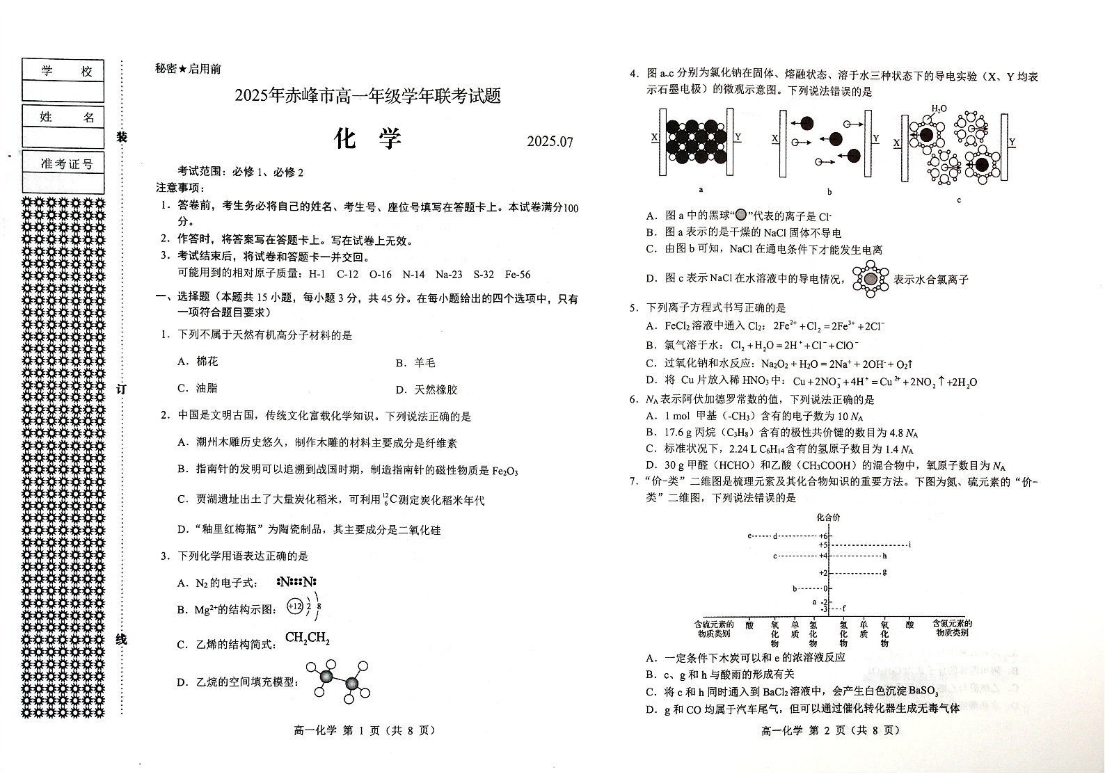 2025年赤峰市高一年级学年联考试题 化学.pdf
