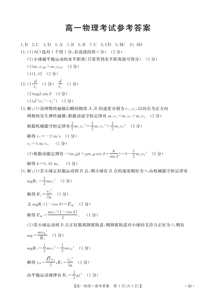 内蒙古2024~2025学年度高一下学期期末考试 物理A2答案.pdf