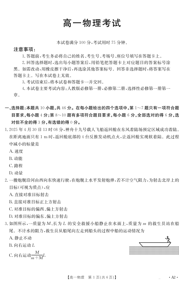 内蒙古2024~2025学年度高一下学期期末考试 物理A2.pdf