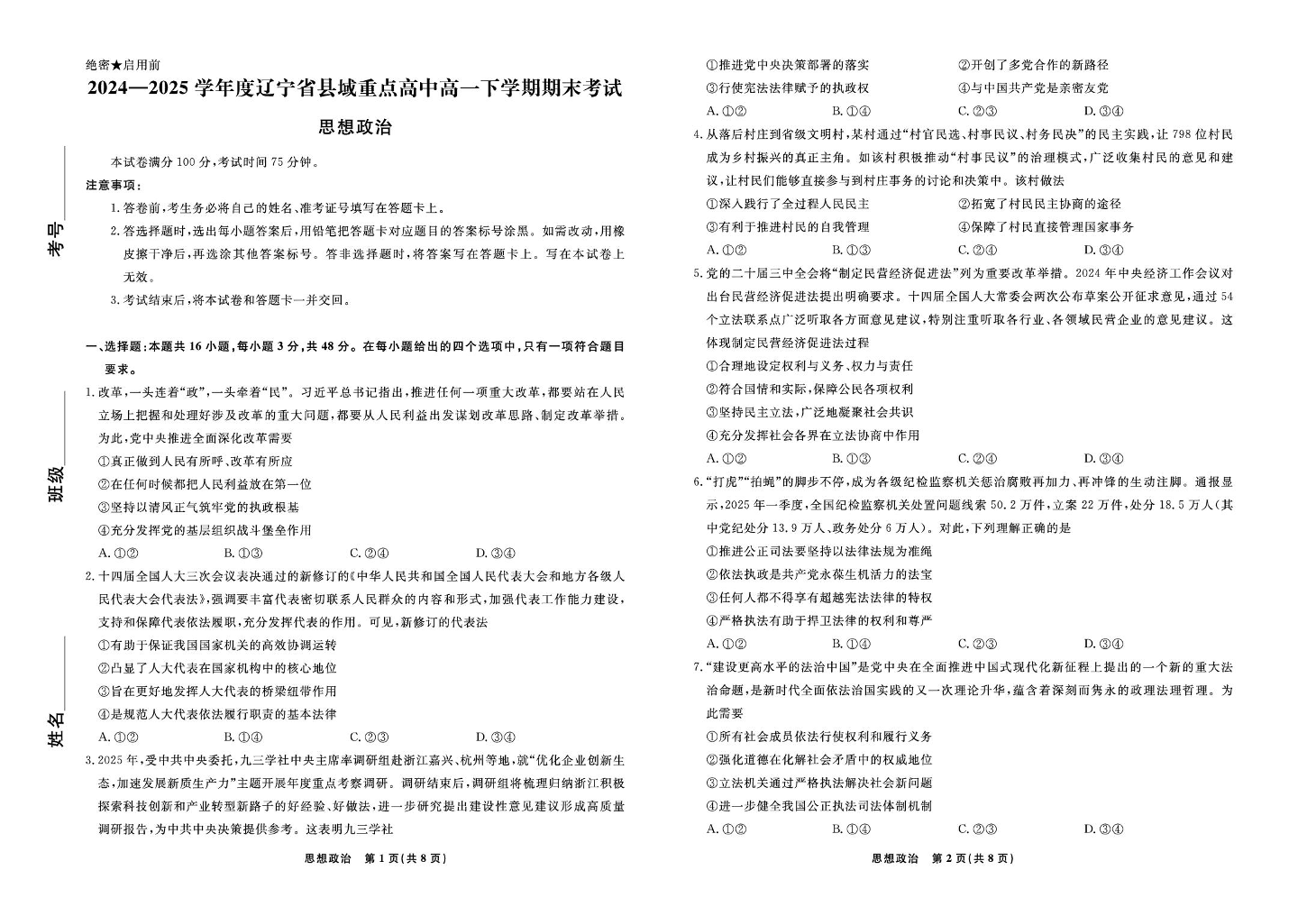 辽宁省县域重点高中2024-2025学年度高一下学期期末考试 政治试卷(含答案).pdf