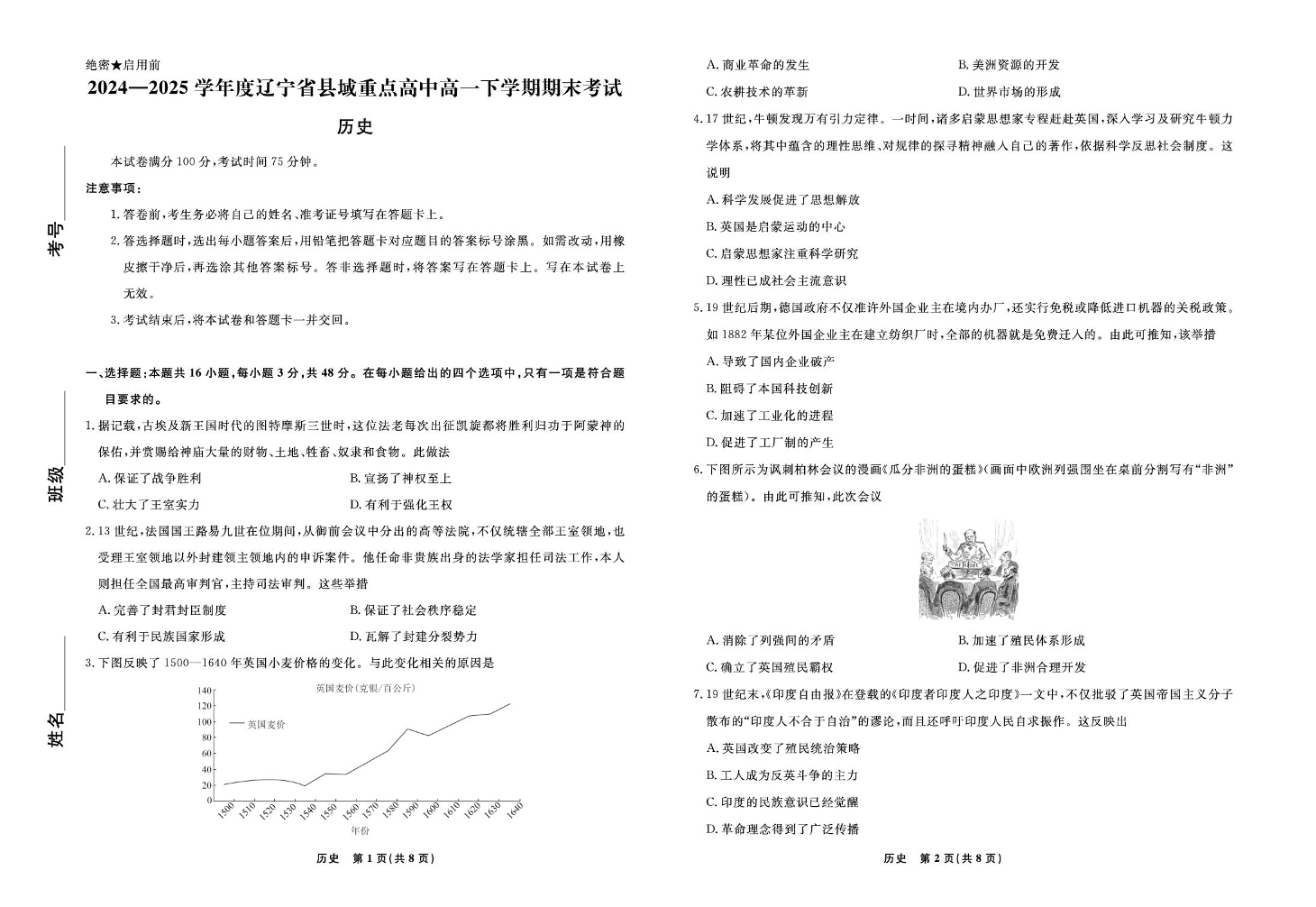 辽宁省县域重点高中2024-2025学年度高一下学期期末考试 历史试卷(含答案).pdf