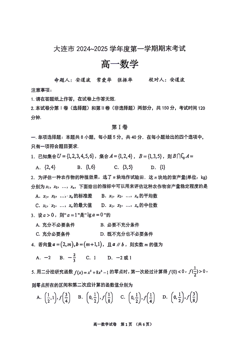 辽宁省大连市2024-2025学年度第二学期高一年级期末考试 数学试卷(含答案).pdf