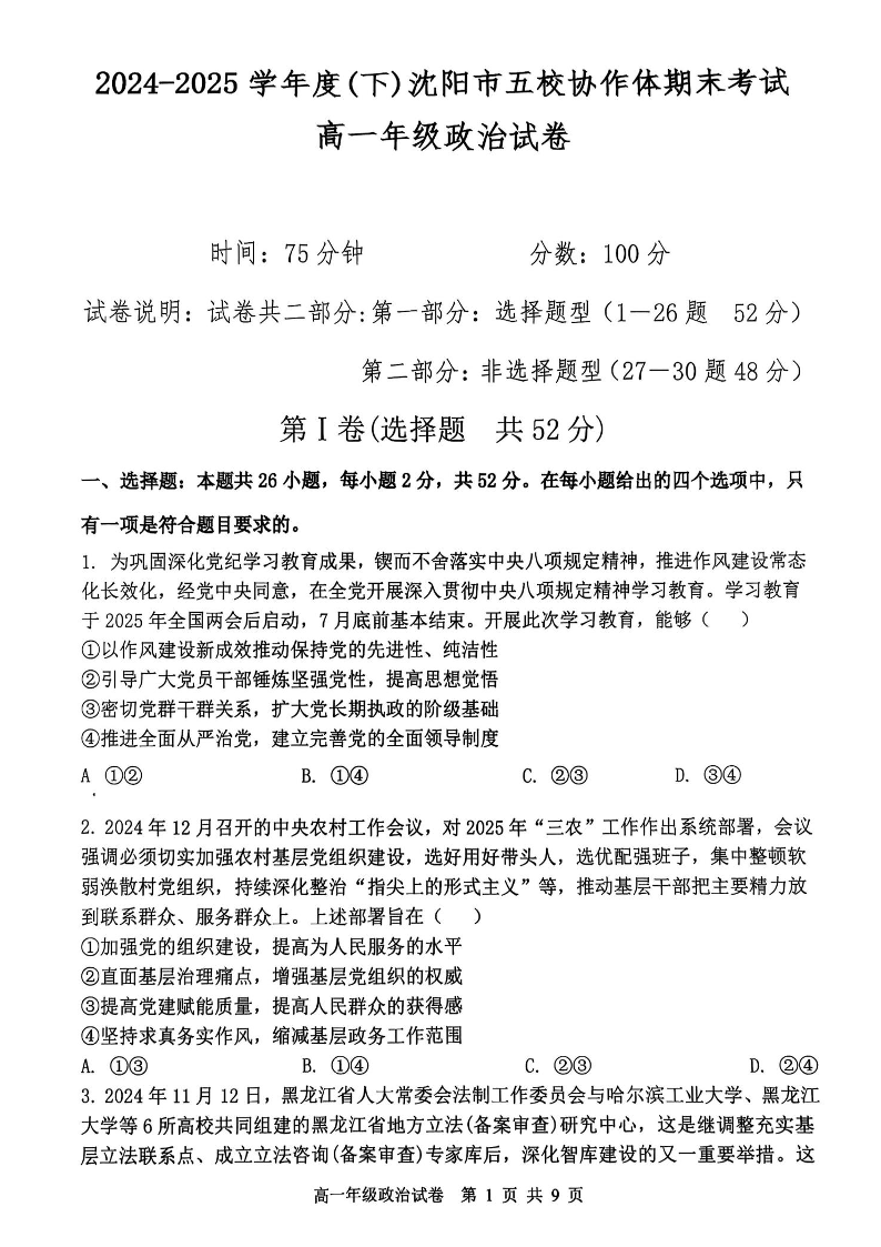 辽宁省2024-2025学年度(下)沈阳市五校协作体高一期末考试 政治试卷(含答案).pdf