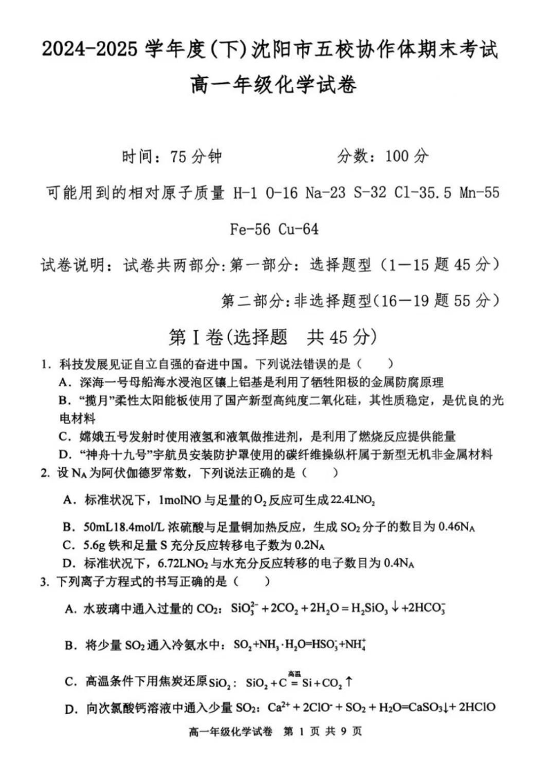 辽宁省2024-2025学年度(下)沈阳市五校协作体高一期末考试 化学试卷(含答案).pdf