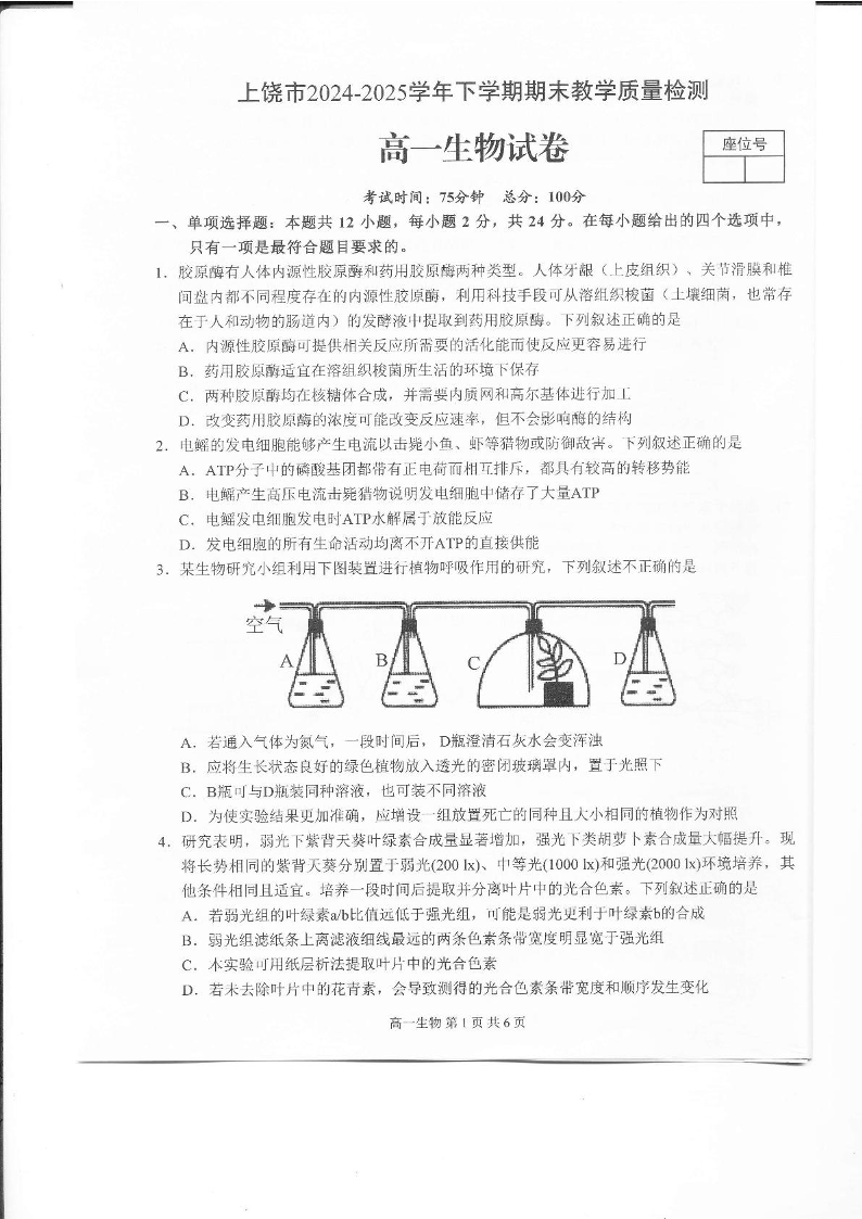 江西省上饶市2024-2025学年高一下学期期末测试 生物试卷(含答案).pdf
