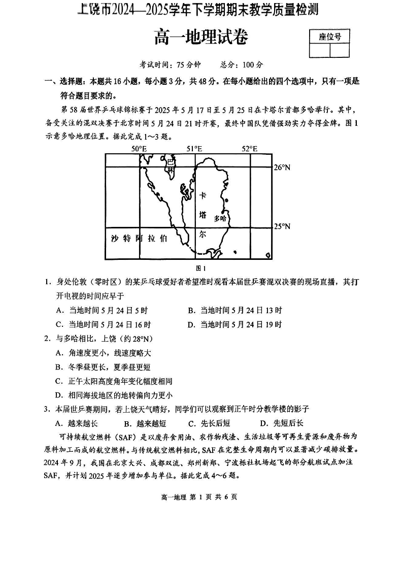 江西省上饶市2024-2025学年高一下学期期末测试 地理试卷(含答案).pdf