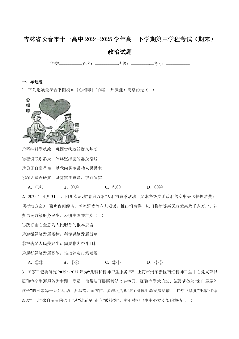 长春市十一高中2024-2025学年高一下学期第三学程考试(期末)政治试卷(含答案).docx
