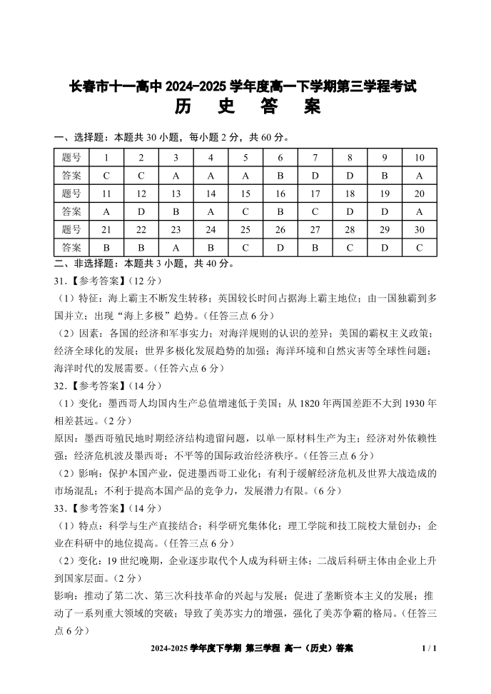 长春市十一高中2024-2025学年高一下学期第三学程考试(期末)历史答案.pdf