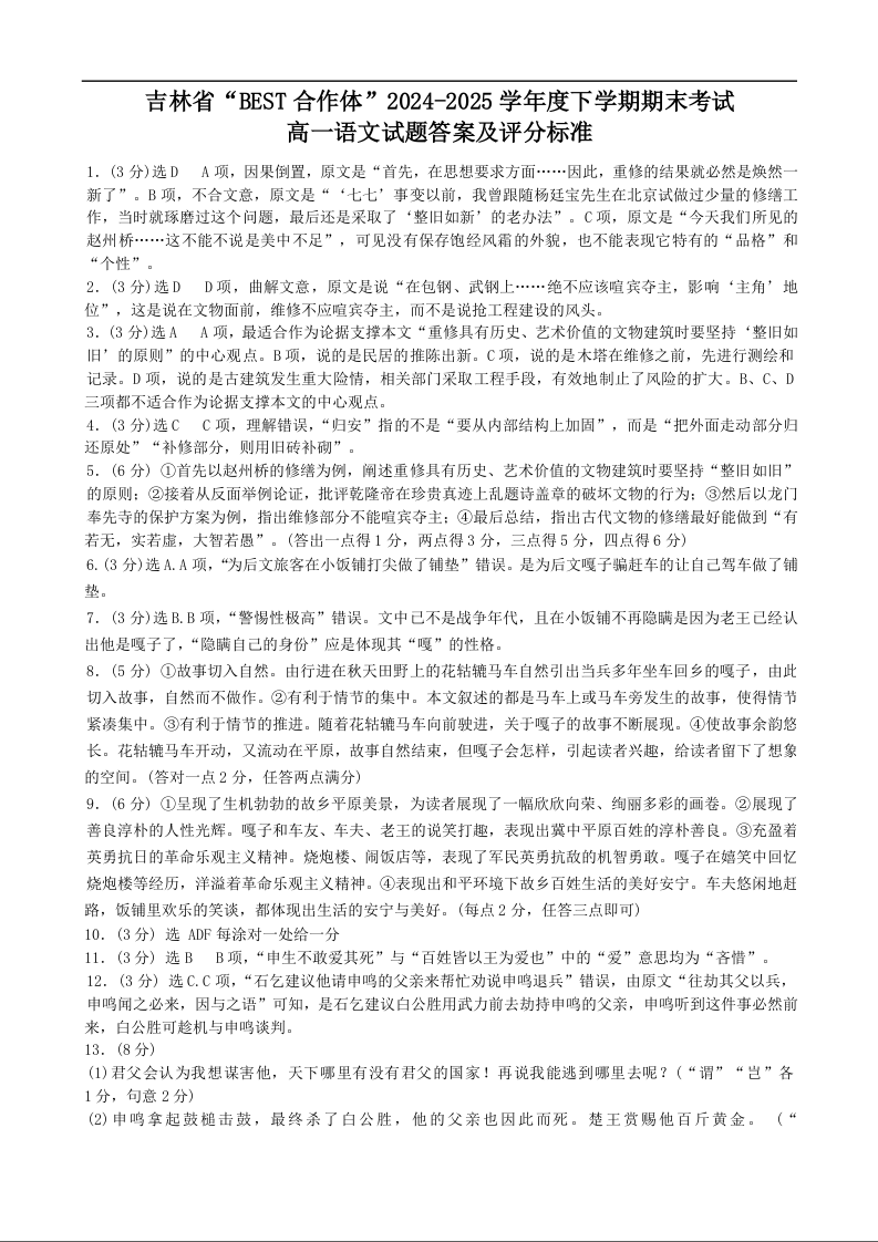 吉林省“BEST合作体”2024-2025学年高一下学期7月期末 语文答案.docx