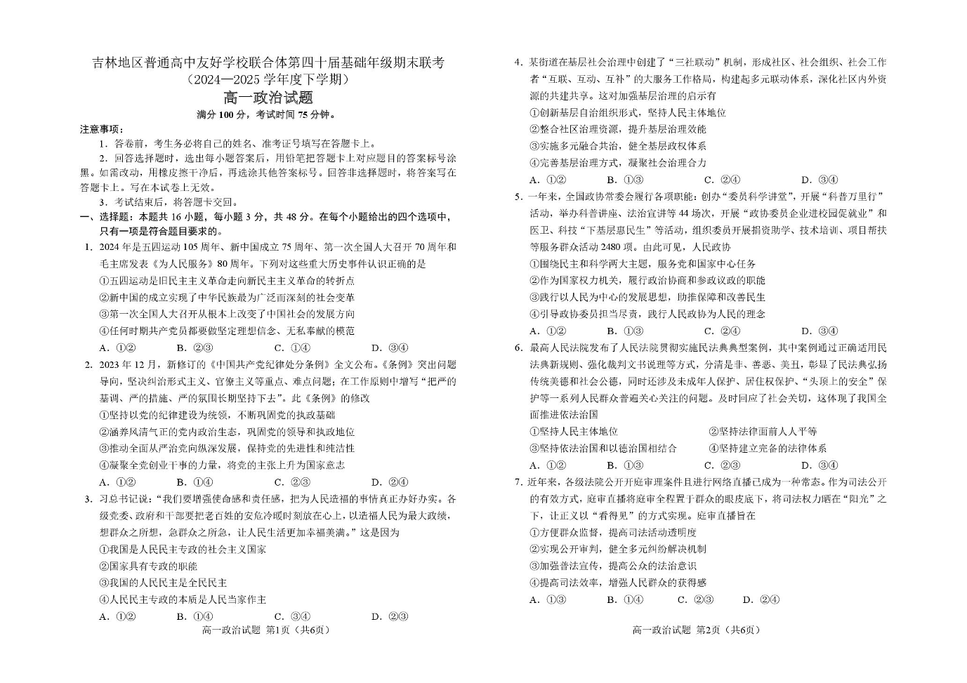 吉林地区普通高中友好学校联合体2024-2025学年高一下学期期末考试 政治试卷(含答案).pdf