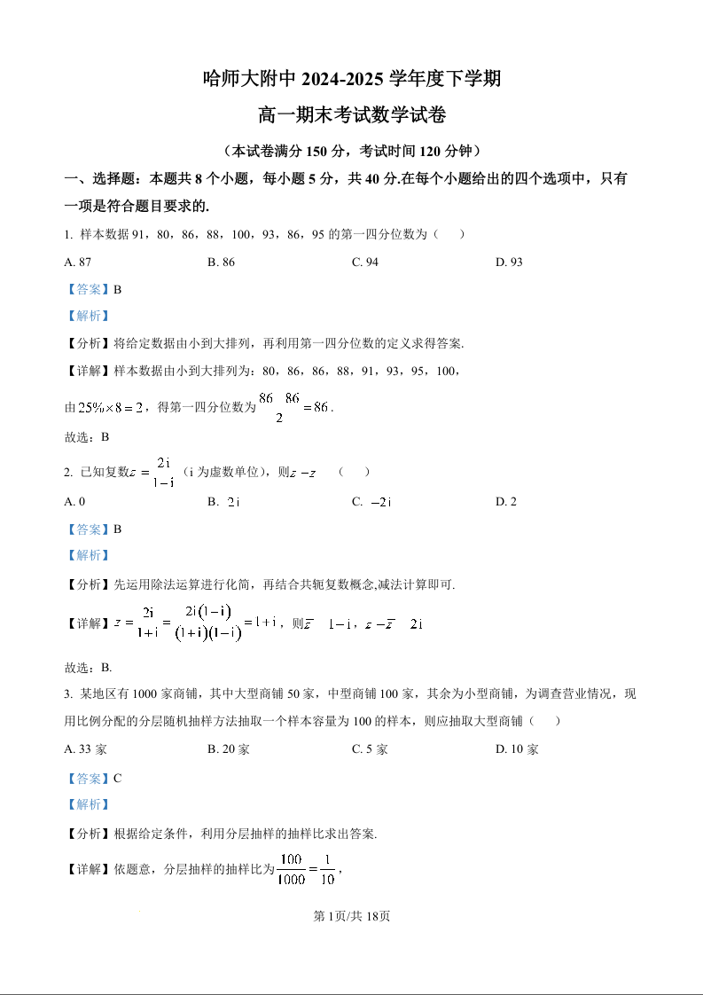 哈师大附中2024~2025学年度下学期高一期末考试 数学答案.docx