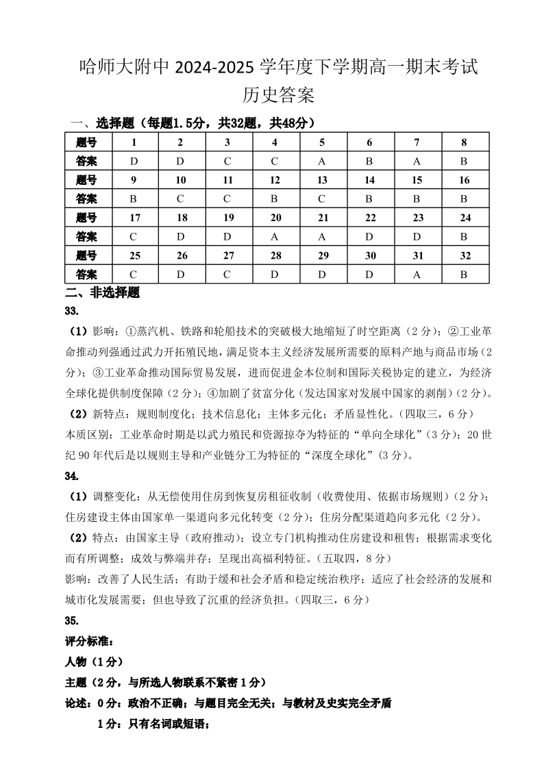 哈师大附中2024~2025学年度下学期高一期末考试 历史答案.pdf