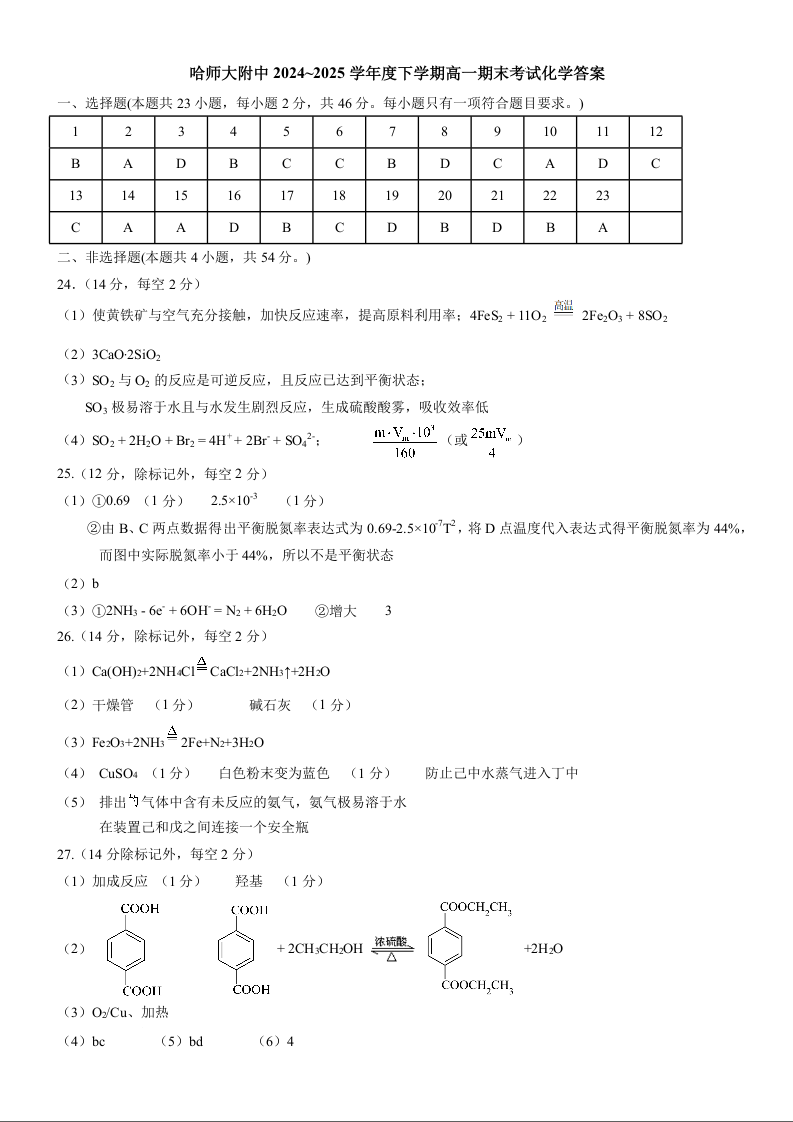 哈师大附中2024~2025学年度下学期高一期末考试 化学答案.docx