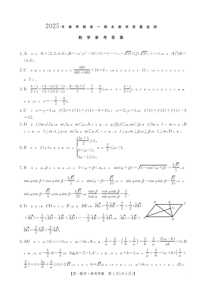 南宁市2024-2025学年高一下学期期末教学质量监测 数学答案.pdf