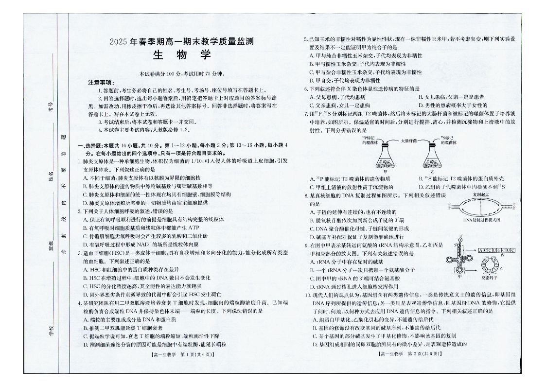 南宁市2024-2025学年高一下学期期末教学质量监测 生物.pdf